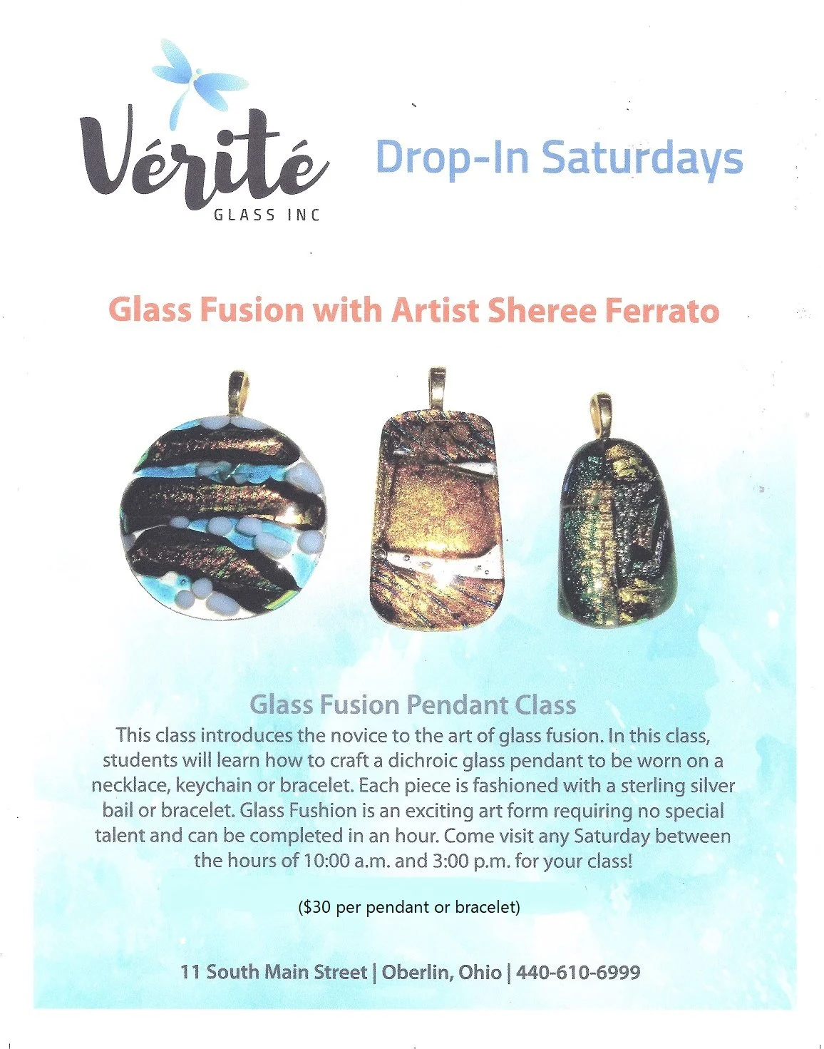 Join us on Saturdays (every Saturday) for our Drop-In Glass Fusion Pendant making workshop! You can just show up and make a beautiful glass pendant, although we prefer you call ahead for scheduling purposes (440) 610-6999